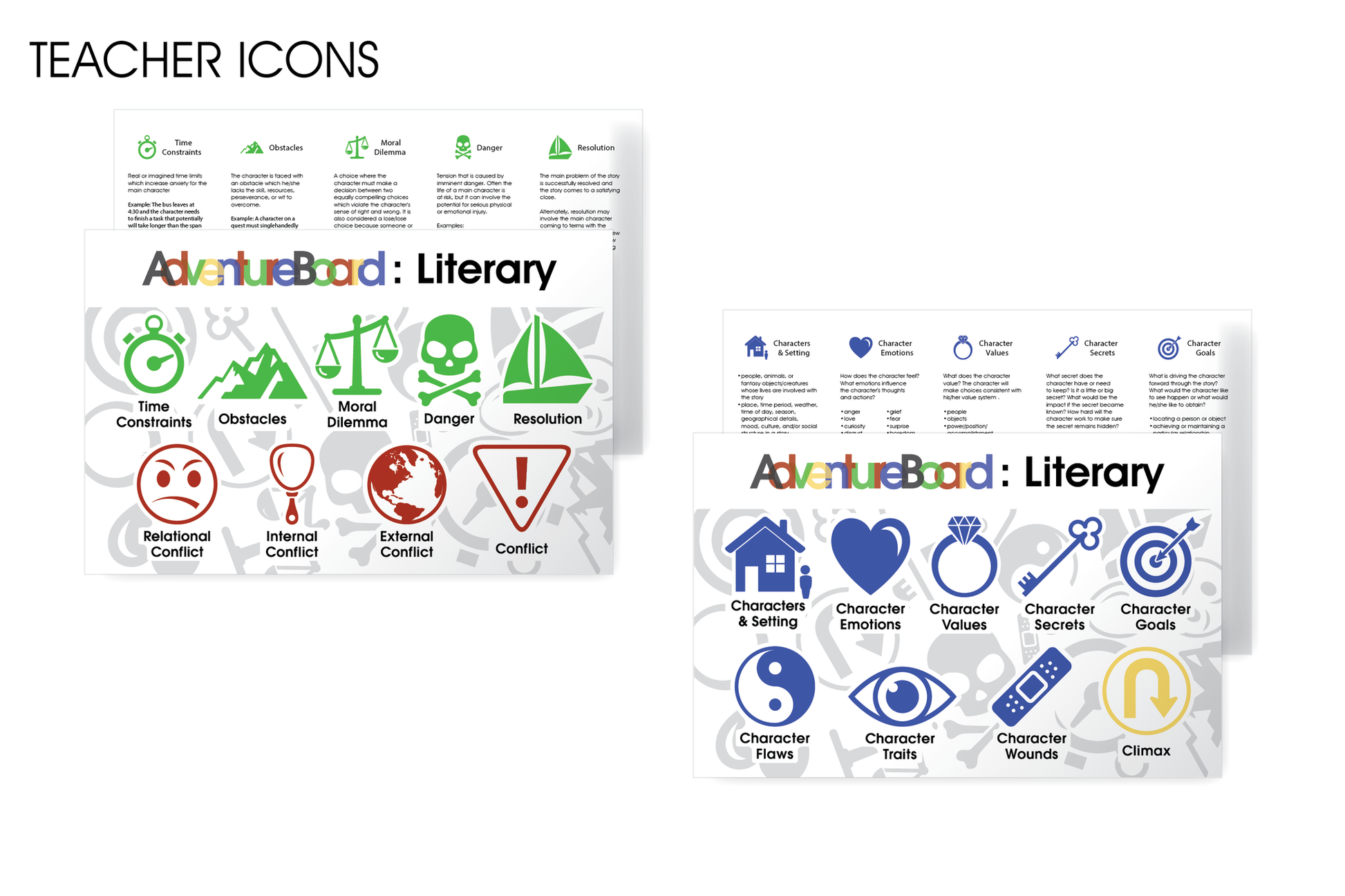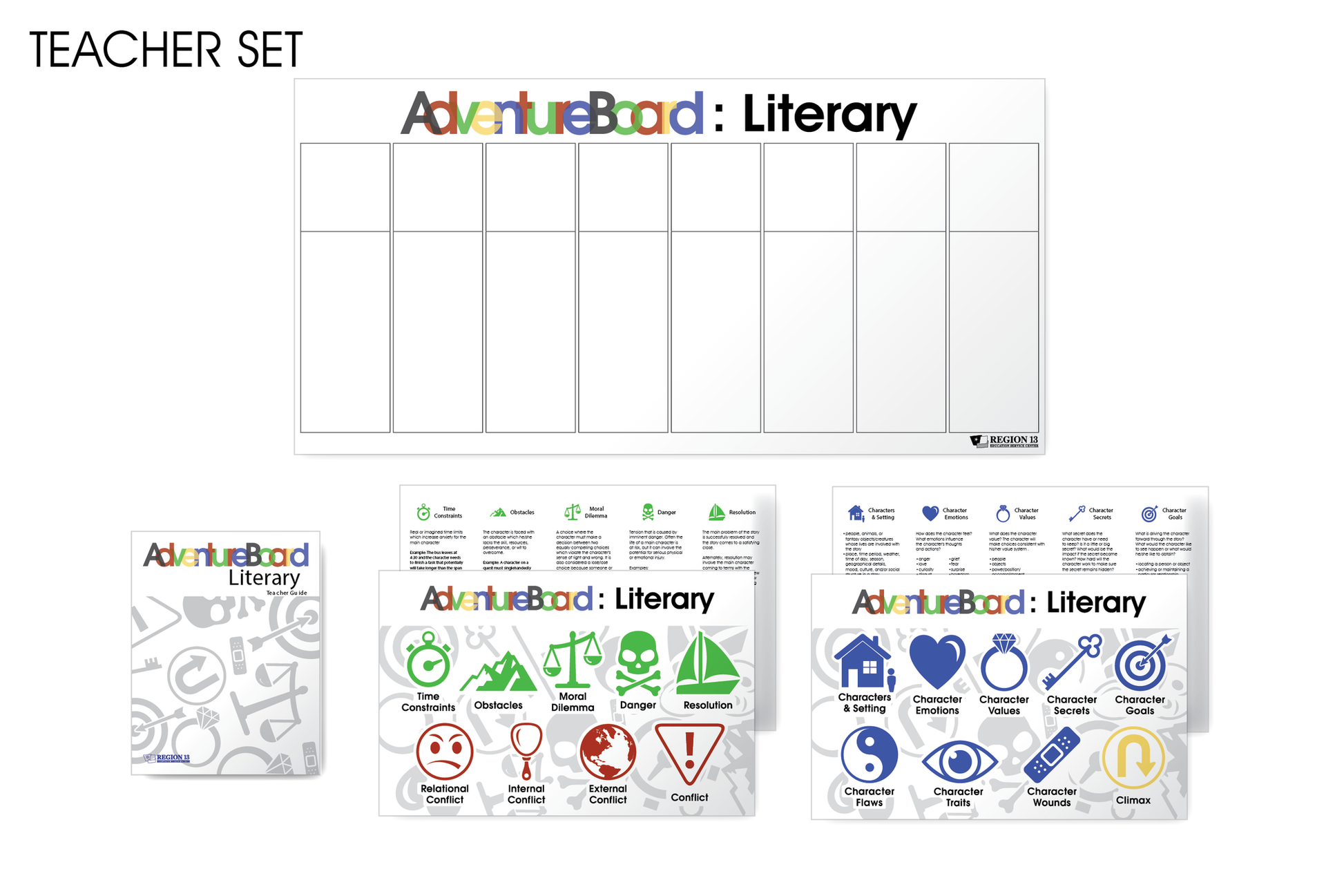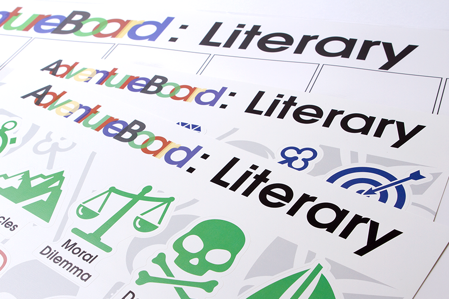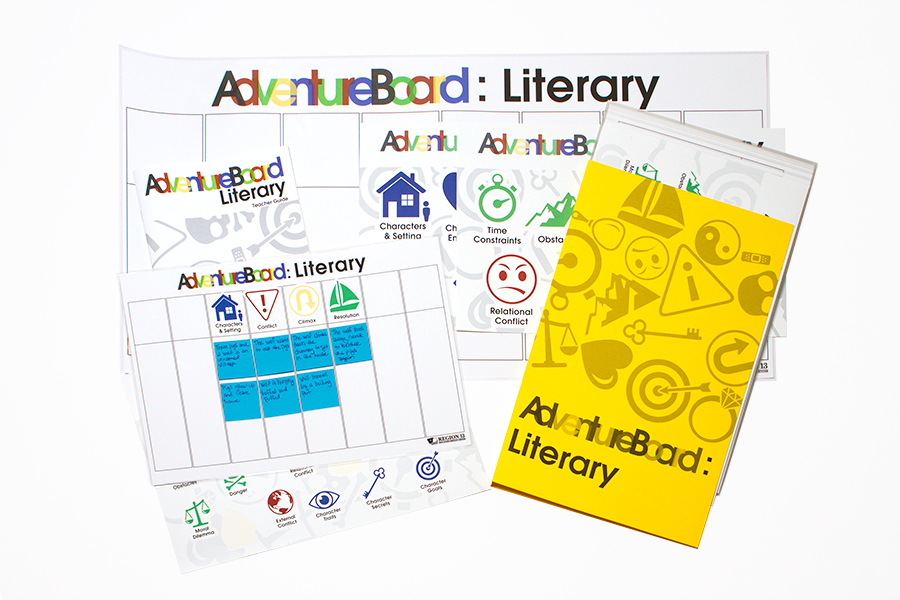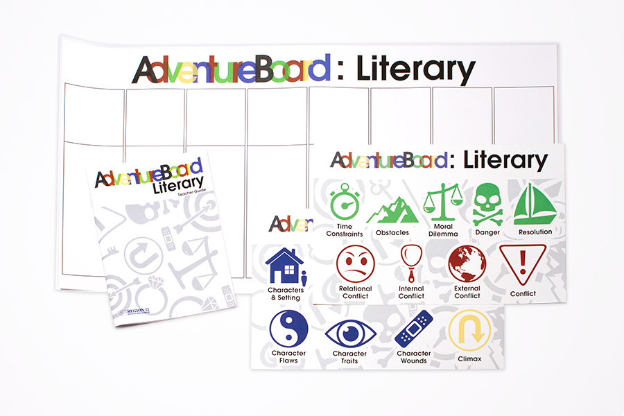 AdventureBoard is a set of storyboards paired with literary concept-building icons on which students create and recreate literary texts. The instructional components facilitate the reading and writing connection through annotation of mentor pieces and adventurous plot construction using the basic and optional icons in the set. Students self-differentiate deepening levels of plot sophistication by adding or limiting icons and exploring various text options. This highly motivating and tactile system creates a classroom that fosters collaborative thinking about authors’ craft while equally supporting individualized learning through the use of the system. The AdventureBoard can be used with all levels and ages of student writers to make enthusiastic scholars who view themselves as writers.
