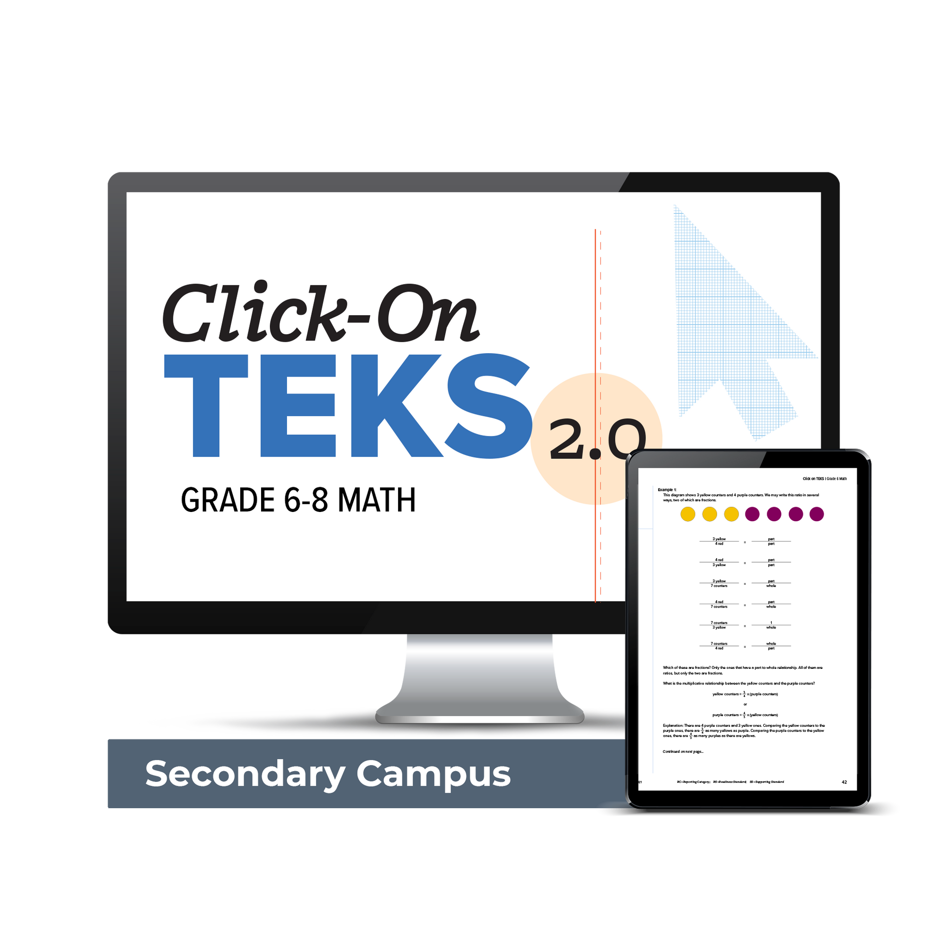 The Click-On TEKS 2.0 Secondary Campus License: 6-8 Math guides teachers through the latest math standards and makes incorporating them into lesson planning simple. It includes: