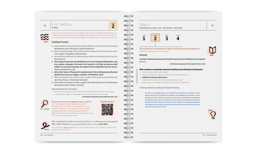 Along with the purchase of the PASL Preparation Guide, candidates will receive access to online resources to support their thinking and execution of the PASL tasks. These resources will include an online journal for recording notes and developing rough drafts for each of the PASL steps, sample forms, and examples of artifact types to consider.