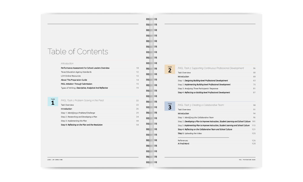 At long last, principal preparation candidates now have a comprehensive resource dedicated to the development of ETS® PASL tasks. The PASL Preparation Guide, developed by the LCM, LLC team, supports candidates in planning, preparing, and performing on their Performance for School Leaders (PASL) tasks!