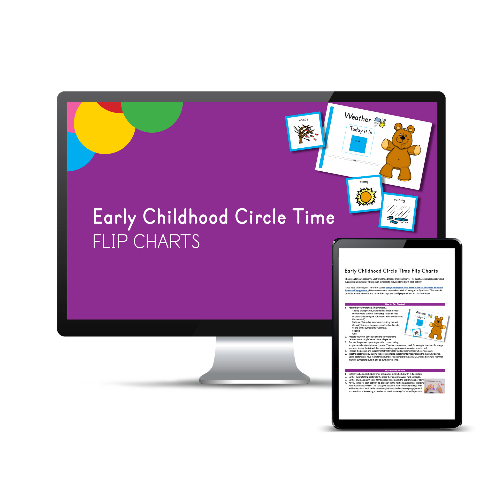 The Early Childhood Circle Time Flipcharts include 9 downloadable PDF posters that each depict one activity commonly taught during circle time, as well as a Supplemental Materials Packet and an Instructional Guide.