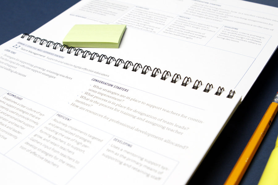 Principals and assistant principals can also use the flipchart as a handy reference tool for their reflection, planning, and growth.