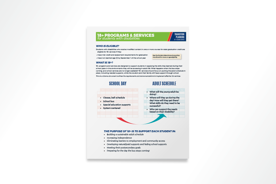 Transition Planning At-A-Glance Series Bundle is the go-to resource to understand the key elements of planning for adulthood for students with disabilities. All educators, transition designees (TEDs), teachers, administrators, related service providers, evaluation specialists, and others, can use this resource to apply these key elements in their role so that every student is connected with community, career, and continued learning beyond high school.